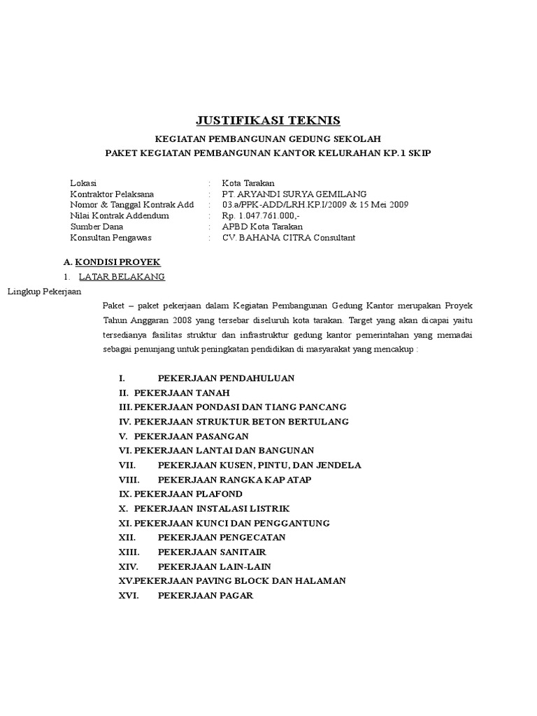 Justifikasi Teknis Justek Bangunan Gedung File Sofcopy Sudut Sipil from 1.bp.blogspot.com Please fill this form, we will try to respond as soon as possible. Kontrak dan gambar kerja ( shop. Text of justifikasi teknis cco. Lampiran justifikasi teknis pada pekerjaan konstruksi sebagai dasar perubahan kontrak. Justifikasi teknis cco.2 dan perpanjangan waktu. Penyebab terjadinya justifikasi teknis pada pekerjaan jalan di sumatera barat. Definisi/arti kata 'justifikasi' di kamus besar bahasa indonesia (kbbi) adalah n putusan (alasan, pertimbangan) berdasarkan hati nurani: Uraian singkat pelaksanaan pekerjaanpekerjaan pembangunan gedung depo arsip kab.