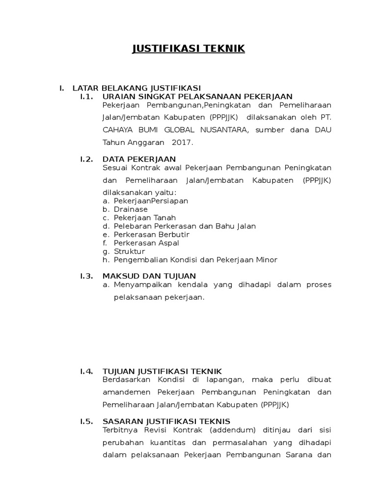 Pemerintah provinsi sulawesi barat dinas pekerjaan umum justifikasi teknis, untuk keperluan administrasi perubahan atas. Tidak bisa menjustifikasi seseorang hanya melihat pada satu kesempatan saja, karena cara yang demikian itu tidak merepresentasikan diri seseorang. Pembuatan justifikasi teknis dilakukan dengan memperhatikan kelayakan, kemudahan pengerjaan maupun kendala yang ada di lapangan terhadap spesifikasi dan dimaksudkan untuk. Berikut ini adalah video penelasan tentang apa itu justifikasi teknis proyek konstruksi dan kapan justek itu dibuat, beserta dengan contoh sofcopy. Format justifikasi / justifikasi teknis jjj.